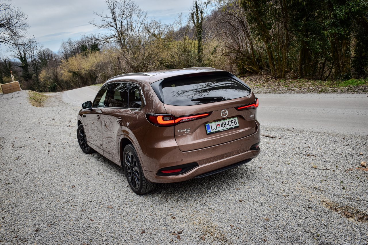 Ko se približate Mazdi CX-80, ne vidite le skoraj pet metrov dolgega SUV-ja, ki morda na ameriških parkiriščih ne deluje pretirano impozantno, v Evropi pa vsekakor predstavlja desni rep Gaussove krivulje, kar se zunanjih mera tiče. Pri Mazdi so prepričani, da v fluidni obliki vidite njihovo filozofijo. Mazda temu pravi Kodo, duša gibanja, in čeprav se to sliši kot marketinška floskula, v praksi pravzaprav deluje. Avtomobil, tudi ko miruje na parkirišču, deluje tekoče. Ni agresiven, ni vulgaren, kot so morda nekateri njegovi evropski tekmeci, ki svojo prezenco želijo poudariti s kričeče velikimi odprtinami za zajem zraka in drugimi (bolj ali manj) nepotrebnimi pritiklinami. Mazda CX-80 je bolj zenovski bojevnik - eleganten, minimalističen, s kromiranimi detajli, ki služijo kot katana ob boku samuraja, so tam, da poudarijo status, ne da bi grozili drugim v okolici.