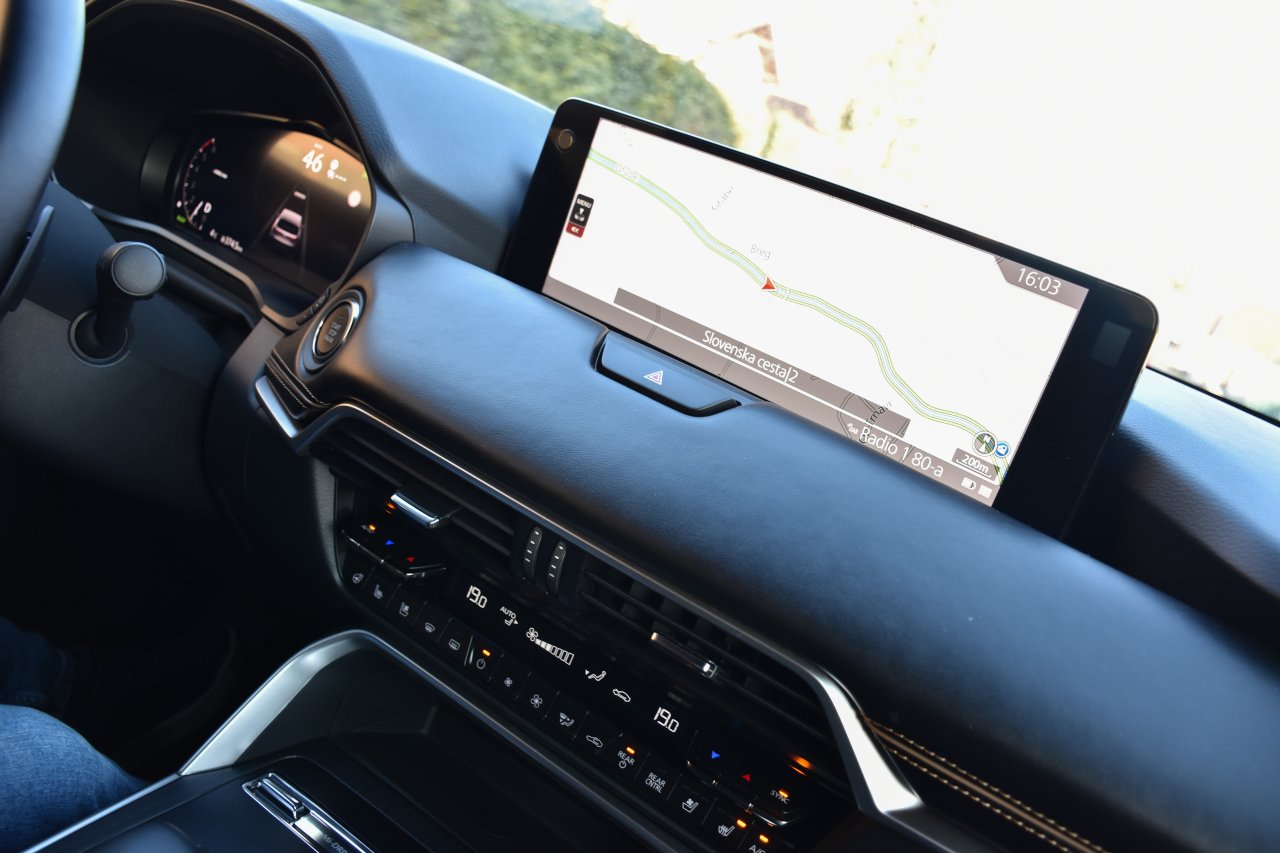 Tudi digitalni del voznikovega delovnega prostora ugaja. Projekcijski zaslon ponuja ravno dovolj informacij in je dobro berljiv, enako velja za digitalno instrumentno ploščo, ki pa vseeno ne ponuja prav veliko možnosti prilagajanja prikaza. Logika upravljanja infozabavnega sistema od voznika zahteva nekaj privajanja, predvsem zaradi prehoda med dotikom in fizičnim upravljanjem. Mazda vas namreč neusmiljeno vzgaja v smislu prometne varnosti - 12,3-palčni zaslon se na dotik odziva izključno takrat, ko avtomobil miruje. Med vožnjo morate za brskanje po menijih uporabiti klasično kombinacijo vrtljivega in potisnega gumba na sredinski konzoli, kar pa v praksi povsem deluje. Grafika na zaslonu je sicer precej enoznačna in zadržana, tu boste zaman iskali visokotehnološki glamur ali najnovejše »bleščave« grafične rešitve, dobite pa pošteno, enostavno in pregledno okolje, ki pa ima v poplavi prekomerno animiranih zaslonov pri tekmecih pravzaprav svoj čar. Navsezadnje brezžična povezava pametnega telefona prek sistemov Apple CarPlay in Android Auto deluje stabilno in povsem brez težav. Induktivna polnilna podloga za polnjenje pametnih mobilnikov je morda za odtenek premajhna. 360-stopinjska kamera je pri pet metrov dolgem vozilu nujna in vsekakor v pomoč, a je njena slika na trenutke čudno popačena. Še posebej je nedorečena t. i. funkcija See-Through-View (pogled »skozi« avtomobil), ki v praksi ne ponuja prave uporabne vrednosti, ob parkiranju pa se trmasto sama vklaplja ravno takrat, ko bi voznik nujno potreboval klasičen pogled na odbijač od zgoraj, prav tako pa avto ne ponuja sistema za samodejno parkiranje, kar je v tem razredu prej izjema kot pravilo.
