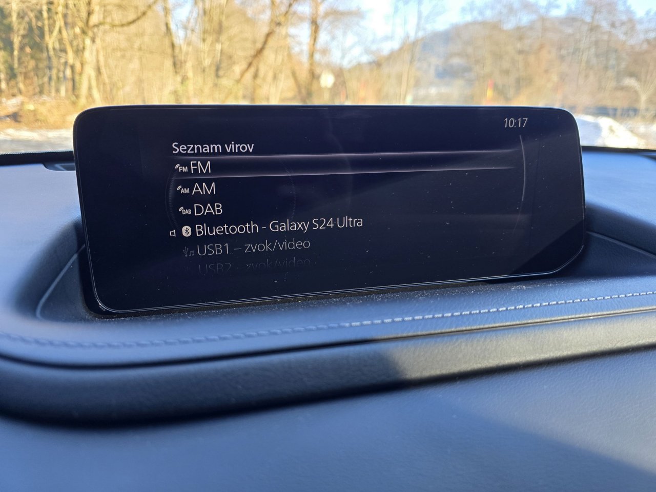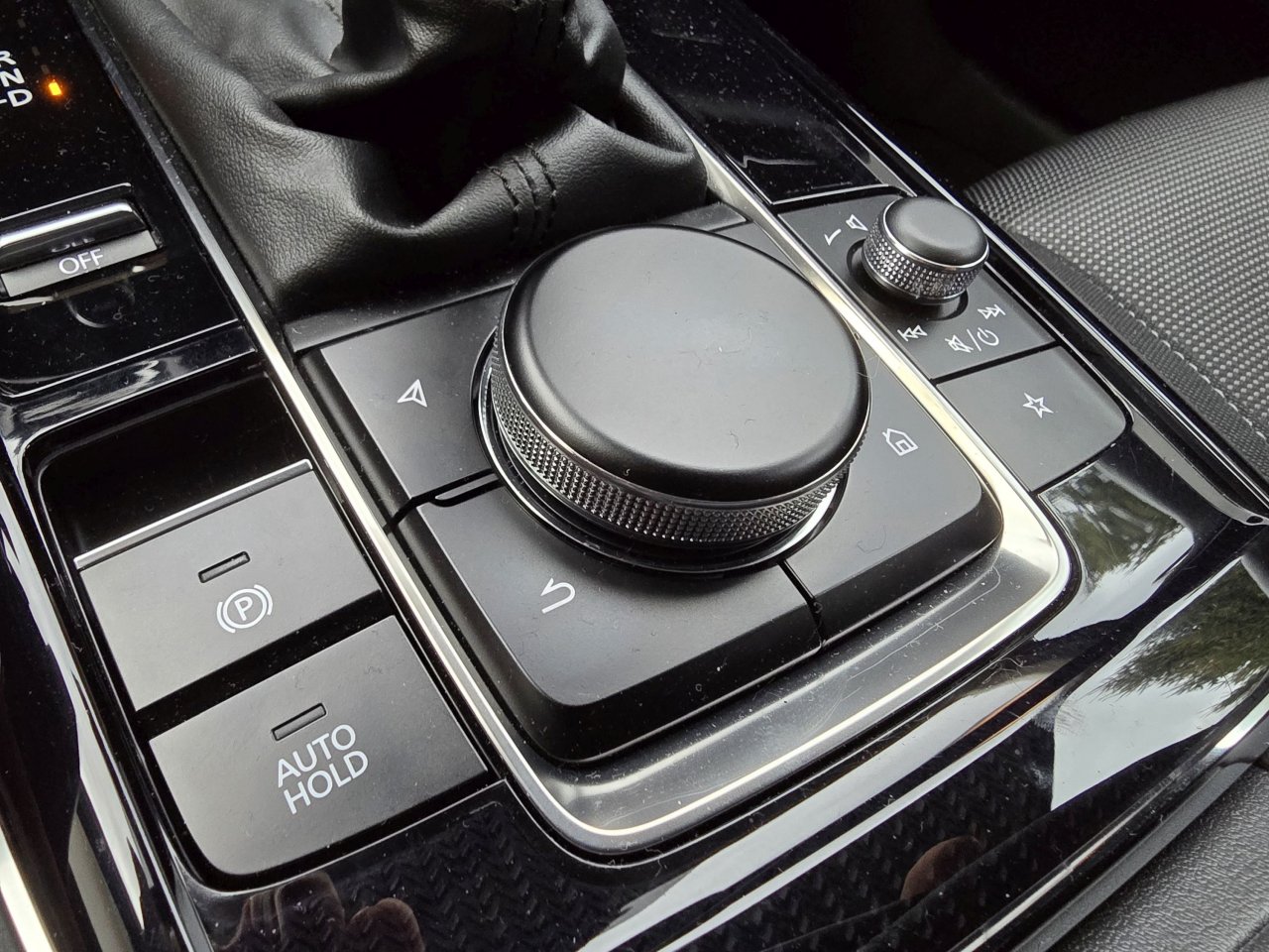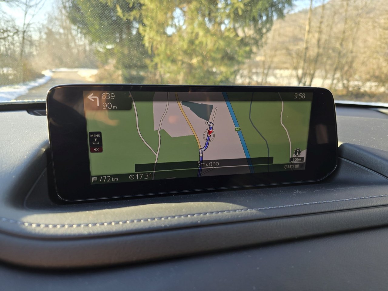 Notranjost je po Mazdini tradiciji enostavna in prestižno oblikovana hkrati. Osnovna linija ni izrazito visoka, zaslon ni integriran, ampak nastavljen nad robom plošče. Povsod je polno klasičnih gumbov s katerimi upravljate na volanu, levo ob njem, na sredinskem delu in na konzoli med sedežema. Armaturna plošča je odeta v prijetno plastiko in prekrita s šivanim materialom. Sredinska konzola je sicer precej široka. Na njej je ročica za samodejni menjalnik. Za njo pa vrtljiv gumb za upravljanje zabavne elektronike in menijev. Zaslon zgoraj je sicer kakovosten, prijetno oblikovno zadržan, ki premore tudi občutljivost na dotik, če ste v recimo Apple Car Play sistemu. Sicer pa se na prste ne odziva. Kdo bi vedel? Zračnike v sredini so razdelili na manjšega pri vozniku in večjega pri sovozniku. Oblikovno je to sicer zelo lepo, usmerjanje zraka pa potrebuje še kakšno dodelavo.