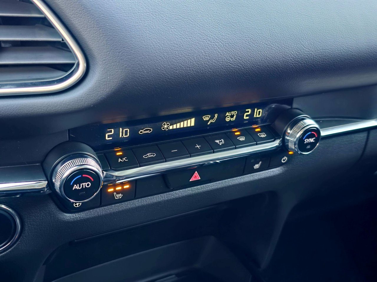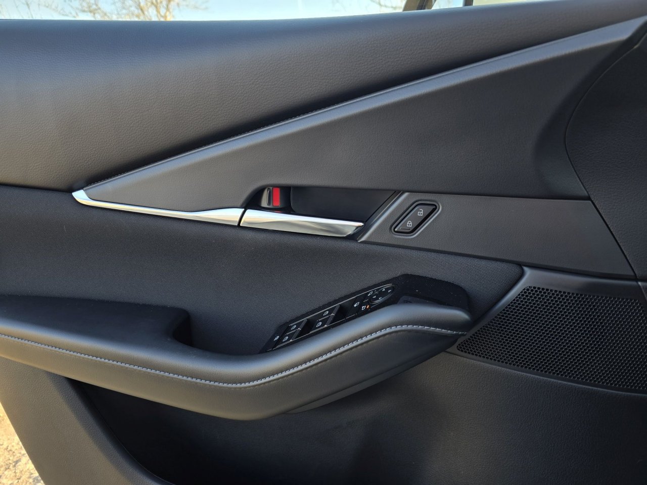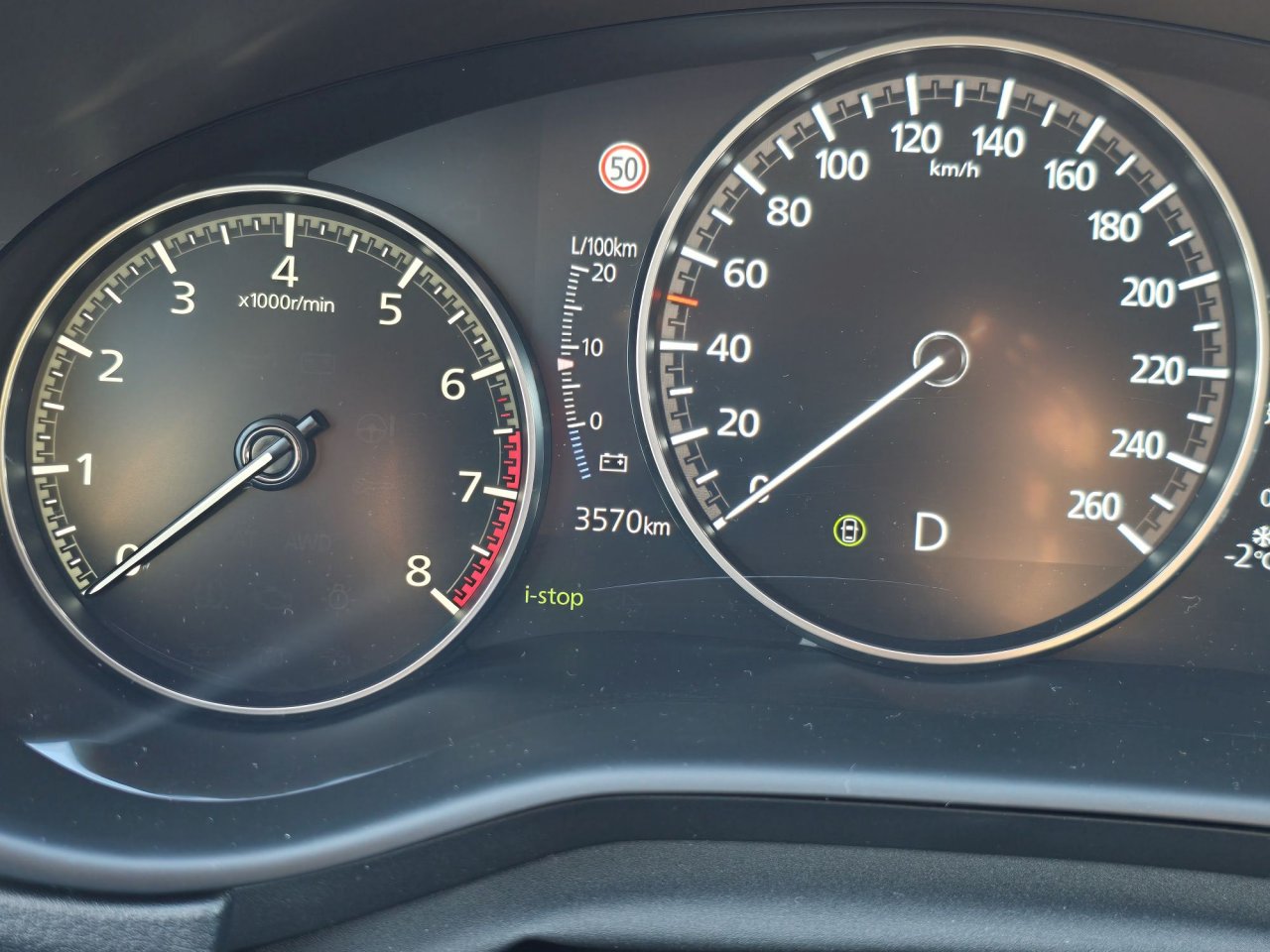 Notranjost je po Mazdini tradiciji enostavna in prestižno oblikovana hkrati. Osnovna linija ni izrazito visoka, zaslon ni integriran, ampak nastavljen nad robom plošče. Povsod je polno klasičnih gumbov s katerimi upravljate na volanu, levo ob njem, na sredinskem delu in na konzoli med sedežema. Armaturna plošča je odeta v prijetno plastiko in prekrita s šivanim materialom. Sredinska konzola je sicer precej široka. Na njej je ročica za samodejni menjalnik. Za njo pa vrtljiv gumb za upravljanje zabavne elektronike in menijev. Zaslon zgoraj je sicer kakovosten, prijetno oblikovno zadržan, ki premore tudi občutljivost na dotik, če ste v recimo Apple Car Play sistemu. Sicer pa se na prste ne odziva. Kdo bi vedel? Zračnike v sredini so razdelili na manjšega pri vozniku in večjega pri sovozniku. Oblikovno je to sicer zelo lepo, usmerjanje zraka pa potrebuje še kakšno dodelavo.
