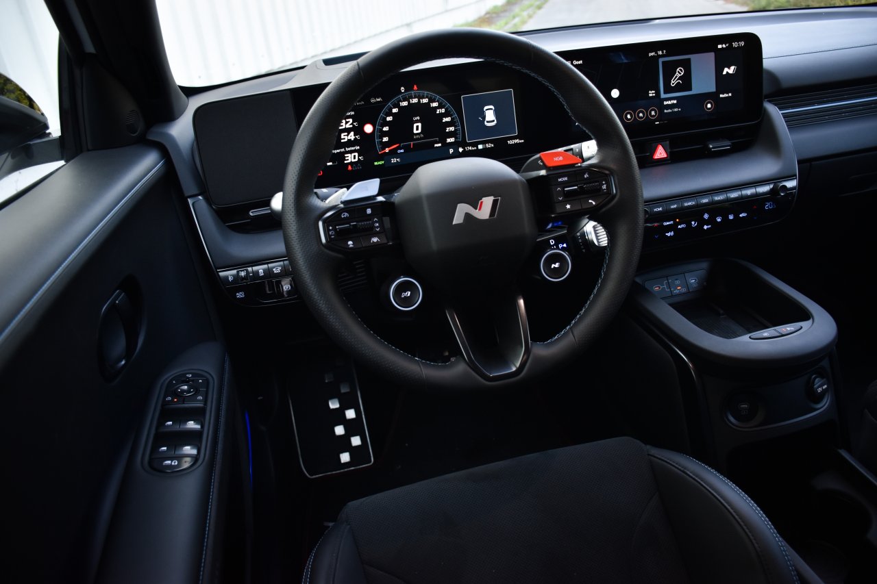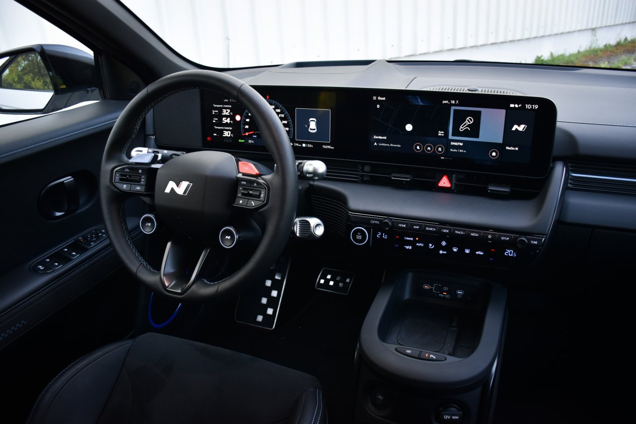 Tudi notranjost je prilagojena družini N, saj vas ob »prihodu na delovno mesto« čakajo športni sedeži, ki brezkompromisno zaobjamejo vaše telo in vam ne pustijo manevriranja levo ali desno, pa čeprav se v osnovi lahko še vedno zanesete na kombinacijo dveh zaslonov, ki ob instrumentni plošči in infozabavnem sistemu skrbita tudi za dostop do številnih nastavitev vožnje (skupaj jih je dvanajst), ki jih bodo do potankosti res lahko izkoristili le najbolj zagrizeni dirkaški »piflarji«. Notranjost je prostorsko res razkošna, saj je na treh metrih medosne razdalje veliko prostora tudi v drugi sedežni vrsti, v prtljažni prostor pa je mogoče spraviti za 480 litrov prtljage, kar je sicer manj kot pri običajni različici, a presenetljivo veliko za rasnega športnika. Omenimo še, da smo na testu v povprečju porabili 24,6 kWh na sto prevoženih kilometrov, kar je glede na moč motorja povsem sprejemljiva vrednost. Tudi zato, ker baterijo na račun Hyundaijeve 800-voltne platforme od 20 do 80 odstotkov lahko napolnite v manj kot dvajsetih minutah. Baterijo je mogoče tudi ročno predgreti, kar zagotavlja boljši izkoristek polnjenja.