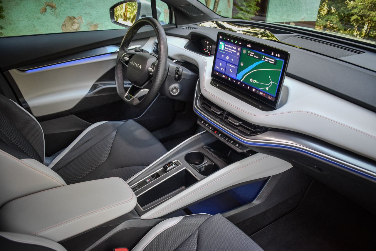 Armaturna plošča je oblikovana preprosto, s sodobnimi linijami, brez stilističnih pretiravanj, vendar z določeno pozornostjo do podrobnosti in s številnimi materiali, ki se zdijo kakovostni in prijetni na otip, pa čeprav je tudi trde plastike kar precej. Pred voznikom se, podobno kot pri vseh koncernskih sorodnikih (pa še pri katerem drugem), nahaja 5,3-palčni digitalni kombinirani instrument, ki je sicer manjši kot pri večini konkurence, a je pri Elroqu vseeno dobil nekaj več možnosti prilagoditev glede želja voznika. Na sredinski konzoli za komunikacijo z infozabavnim sistemom skrbi še 13-palčni zaslon na dotik, kot ga že najdemo v Škodinih modelih višjih segmentov, pri čemer je tudi pri Elroqu kamera za vzvratno vožnjo še vedno nizke ločljivosti. Pohvaliti velja, da so Čehi za upravljanje klimatske naprave ohranili fizične gumbe, za nastavitev glasnosti radia pa je potrebno podrsati po potenciometrični letvici pod zaslonom infozabavnega sistema.