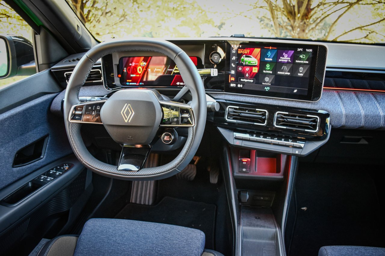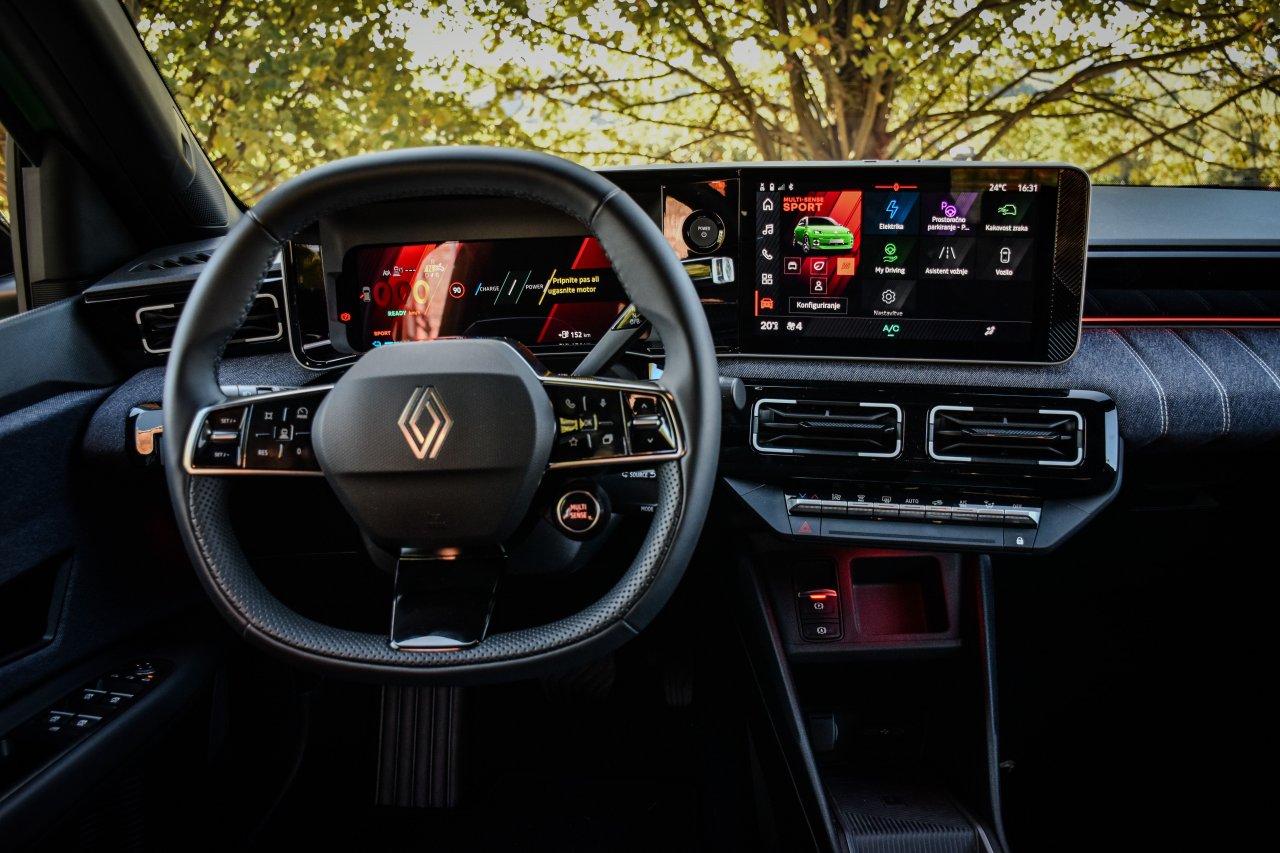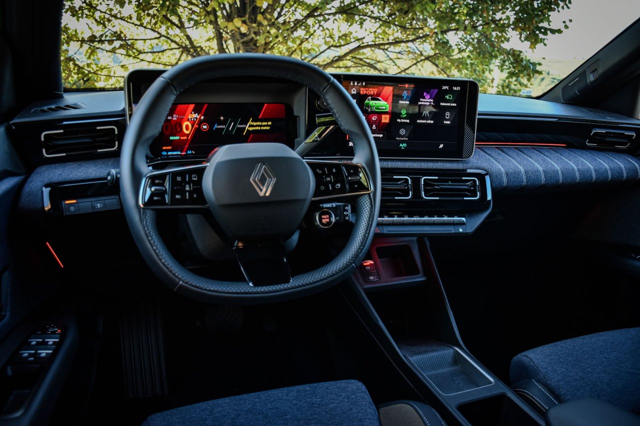 Tudi v notranjosti se tradicija in sodobnost prepletata. Na eni strani ima voznik tako pred sabo dva dobro odzivna 10,1-palčna zaslona, ki opravljata delo instrumentne plošče in infozabavnega sistema OpenR Link, povezanega s storitvami Google, hkrati pa pred sovoznikom del armaturne plošče zaobjema tkanina v duhu prešitega jeansa, ki daje notranjosti retro-veselo noto. Fizični gumbi za nadzor klime so dobrodošla funkcija, medtem ko domiselni (opcijski) dodatki, kot je zdaj že znamenito držalo za bageto, dodajajo edinstven francoski pridih. Tudi pri Petici so pri Renaultu uporabili izbirnik vožnje brez stopnje P, kar sprva marsikoga zmede, a njeno funkcijo nadomešča električna ročna zavora.