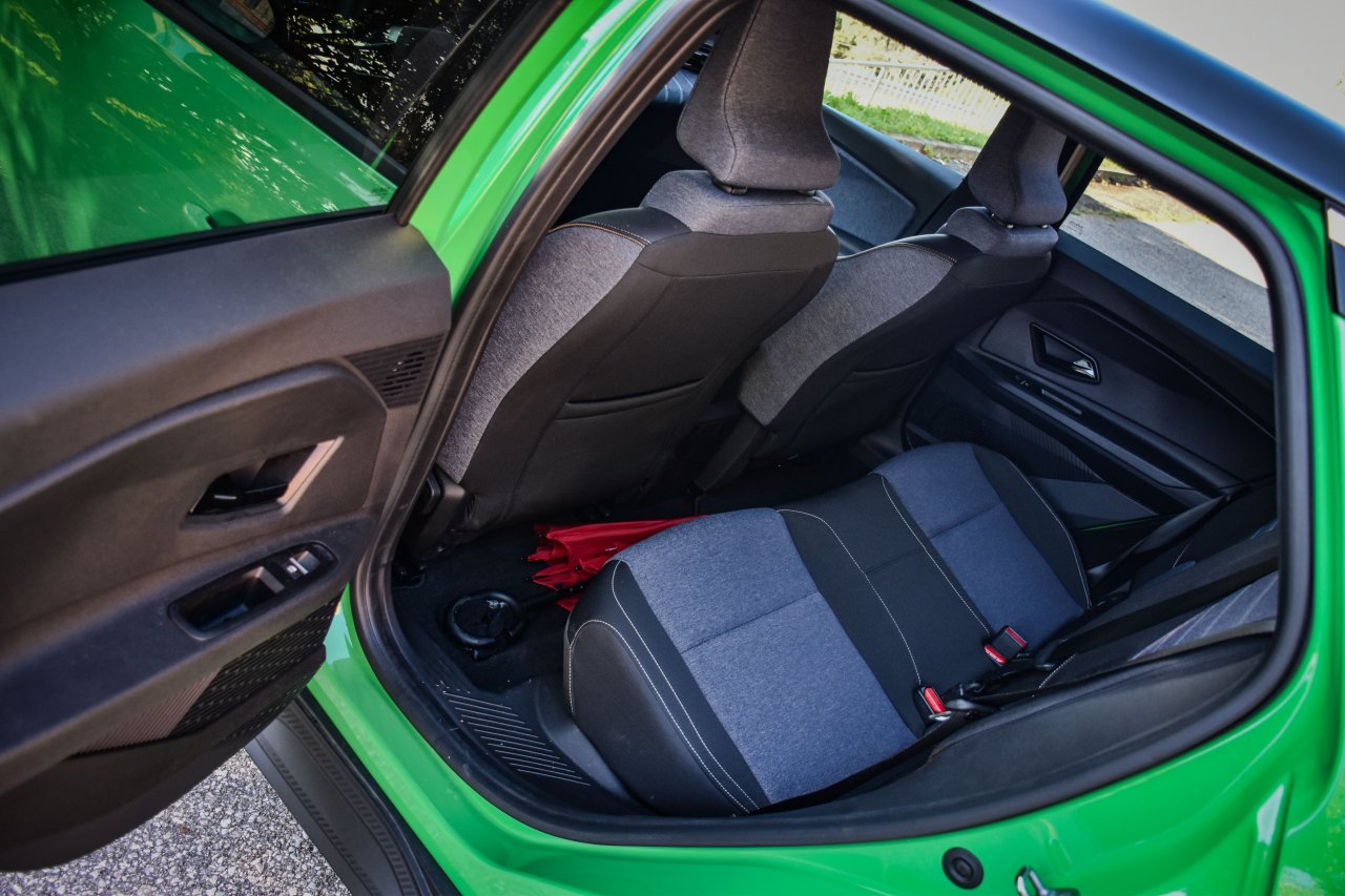 Sprednja sedeža, obdana v tkanino iz popolnoma recikliranih materialov, sta udobna in nudita dobro stransko oporo, omeniti pa velja še rebrasto strešno oblogo, ki prav tako prispeva k razigranosti notranjega oblikovanja. V drugi sedežni vrsti prostora sicer ni v izobilju, še posebej za noge ne, se pa na krajšo pot z Renaultom 5 lahko vseeno podajo štirje odrasli potniki. A si morajo biti dokaj blizu. Tako in drugače. Je pa zato na drugi strani prtljažnik s 328 litri uporabnega prostora dovolj prostoren tudi za daljše izlete v dvoje.