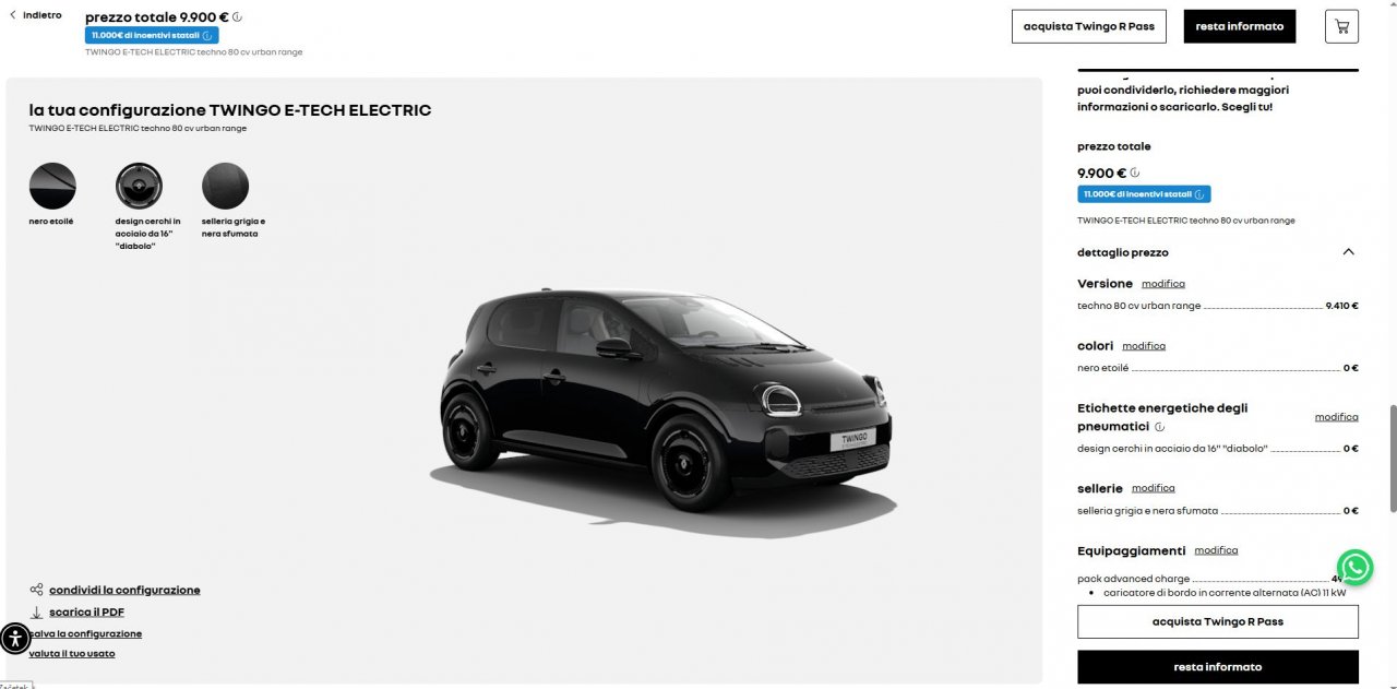 Italijanski zastopnik na spletni strani oglašuje ceno 9.900 evrov, z vključeno državno subvencijo. Tako visok znesek dobijo le tisti, ki izpolnjujejo kar nekaj specifičnih pogojev, med drugim tudi to, da njihovi letni prihodki niso višji od 30 tisoč evrov. Trenutno je v konfiguratorju na voljo le dražja verzija Twinga Evolution, ki stane 21.100 evrov, v primeru pridobitve predkupne pravice (Twingo R Pass) se ta cena zniža še za dodatnih 690 evrov, med »obvezno« opremo pa je vključen tudi paket Advanced Charge, ki stane 490 evrov, in tako končna cena s subvencijo za kupca znaša 9.900 evrov. A pozor. Ko bo na voljo tudi cenejša verzija Twinga za 19.500 evrov (od pomladi 2026), se cena s popustom Renaulta in subvencijo lahko zniža na vsega 7.810 evrov.